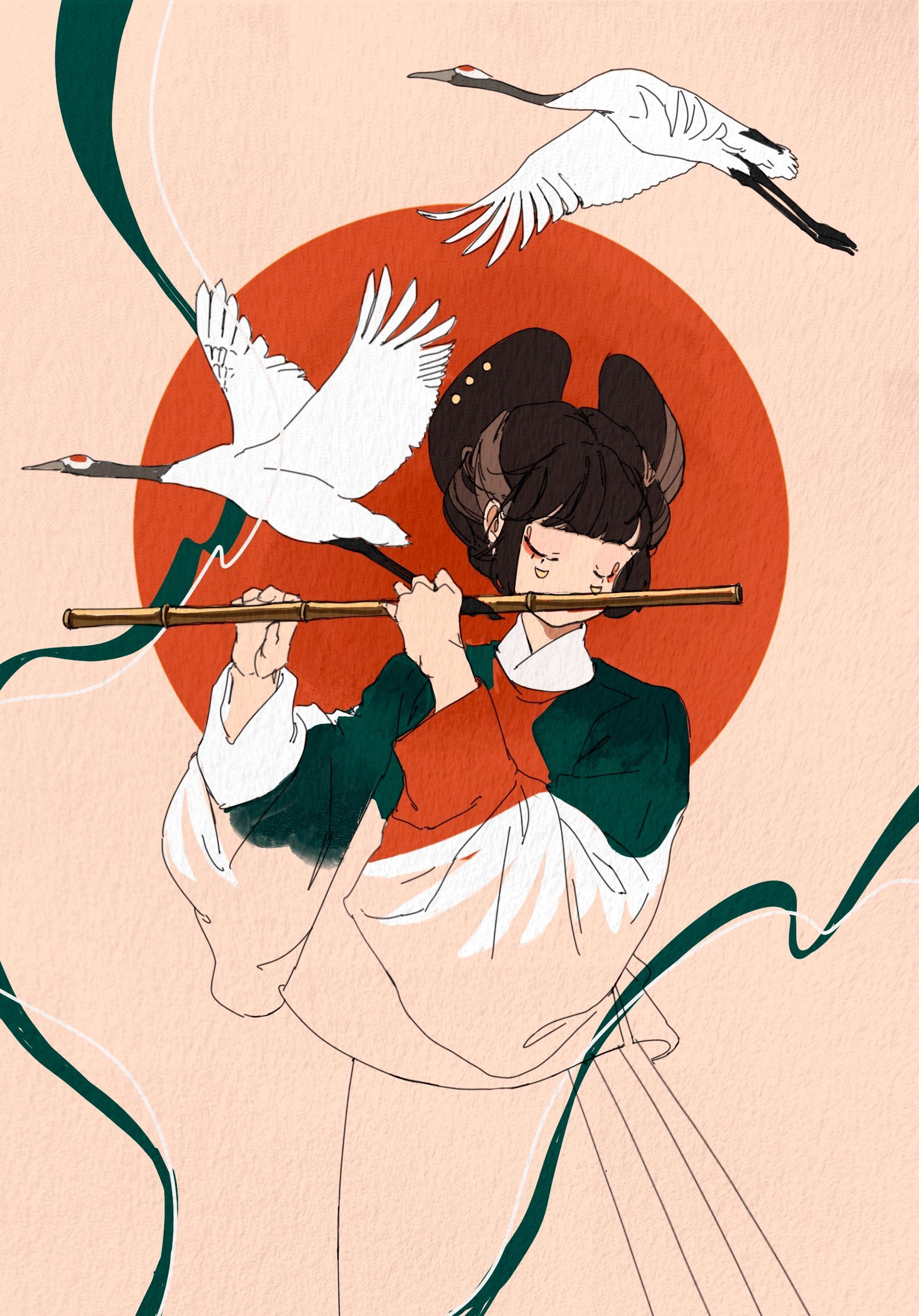 My family always reminds me that even though living in a country with ethnic diversity, I should never forget my cultural heritage. I draw myself as a girl in a traditional Chinese costume blowing a bamboo flute, a time-honored musical instrument. The melodious music awakens my reverence for Chinese culture, and makes me feel a connection between self-identity and ancestral heritage. The elements surrounded are totems with special meanings: the red sun in the middle, which creates a strong color contrast with the green, represents the vitality; the white cranes in the background, which neutralize the visual impact, are the symbols of wisdom, harmony and eternity which are my wishes for our world.
