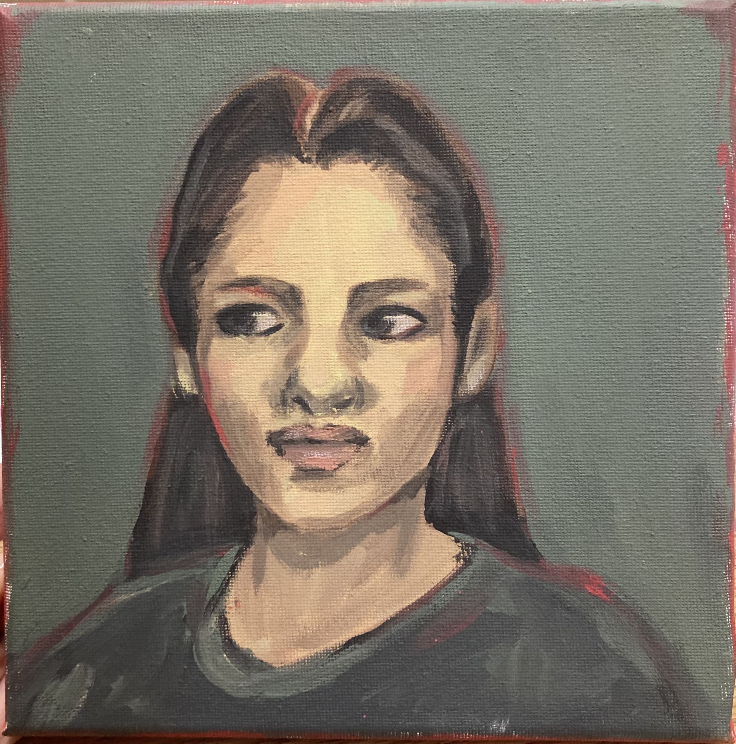 My favorite part of this artwork is the color. I wanted to create a piece that was dull but had some sort of pop, so I used a murky grey/green and a red for contrast. This art piece and a loose form of a self portrait it doesn’t look much like me but many of her features represent mine.