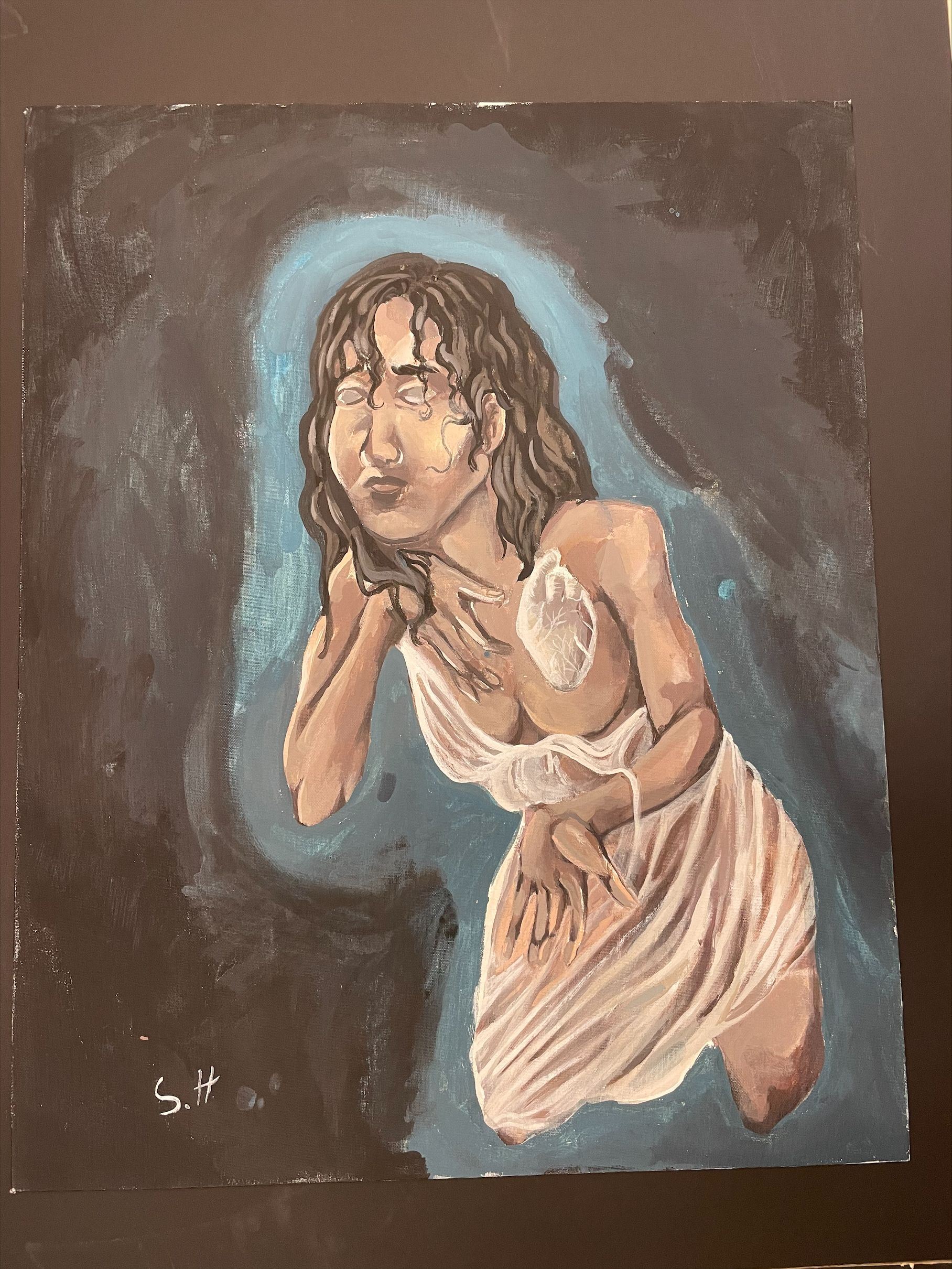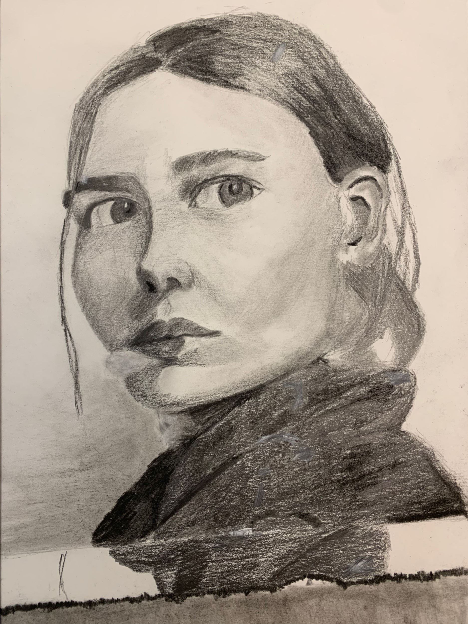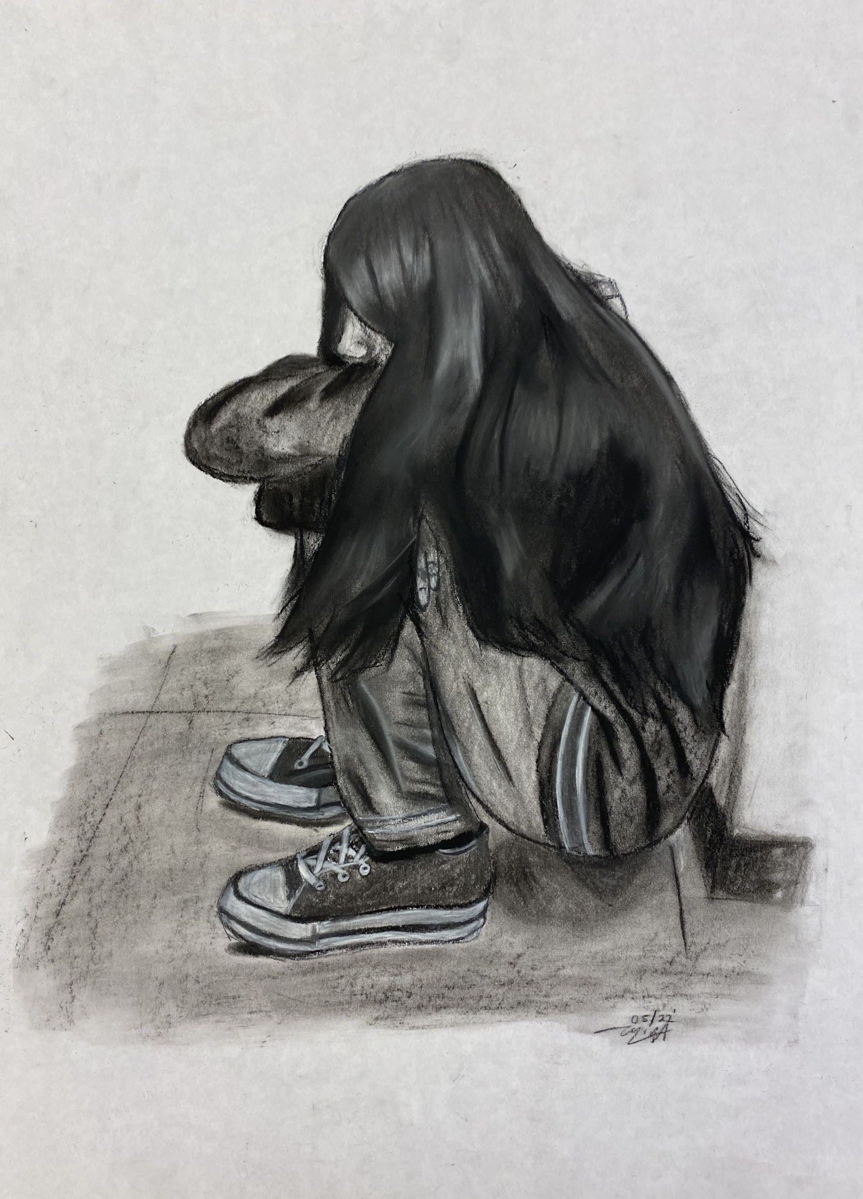 My favorite part is the hair and I don’t necessarily have a least favorite part for this piece. My inspiration behind this was the feeling of loneliness and sadness. I would try to do better on the shadows and the wrinkles on the clothing because I think it would add a lot more detail to pay attention too. I learned how to blend different chalks together to give highlights on certain areas like the hair in which the hair was also the most surprising to me. To make this artwork, I sketched out the main shapes and started adding more detail as I went on. I eventually progressed into the shading and shadows and created this piece.