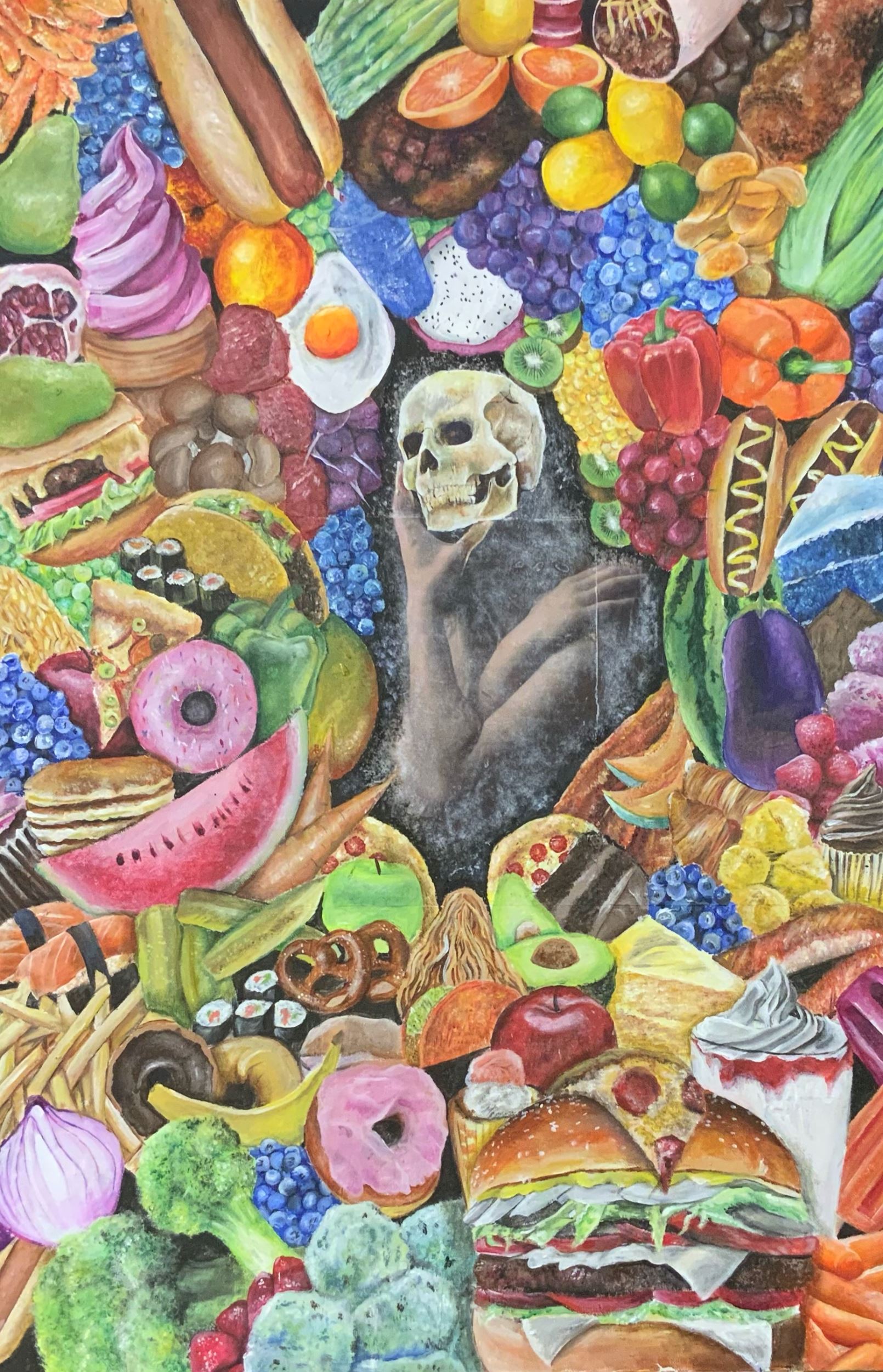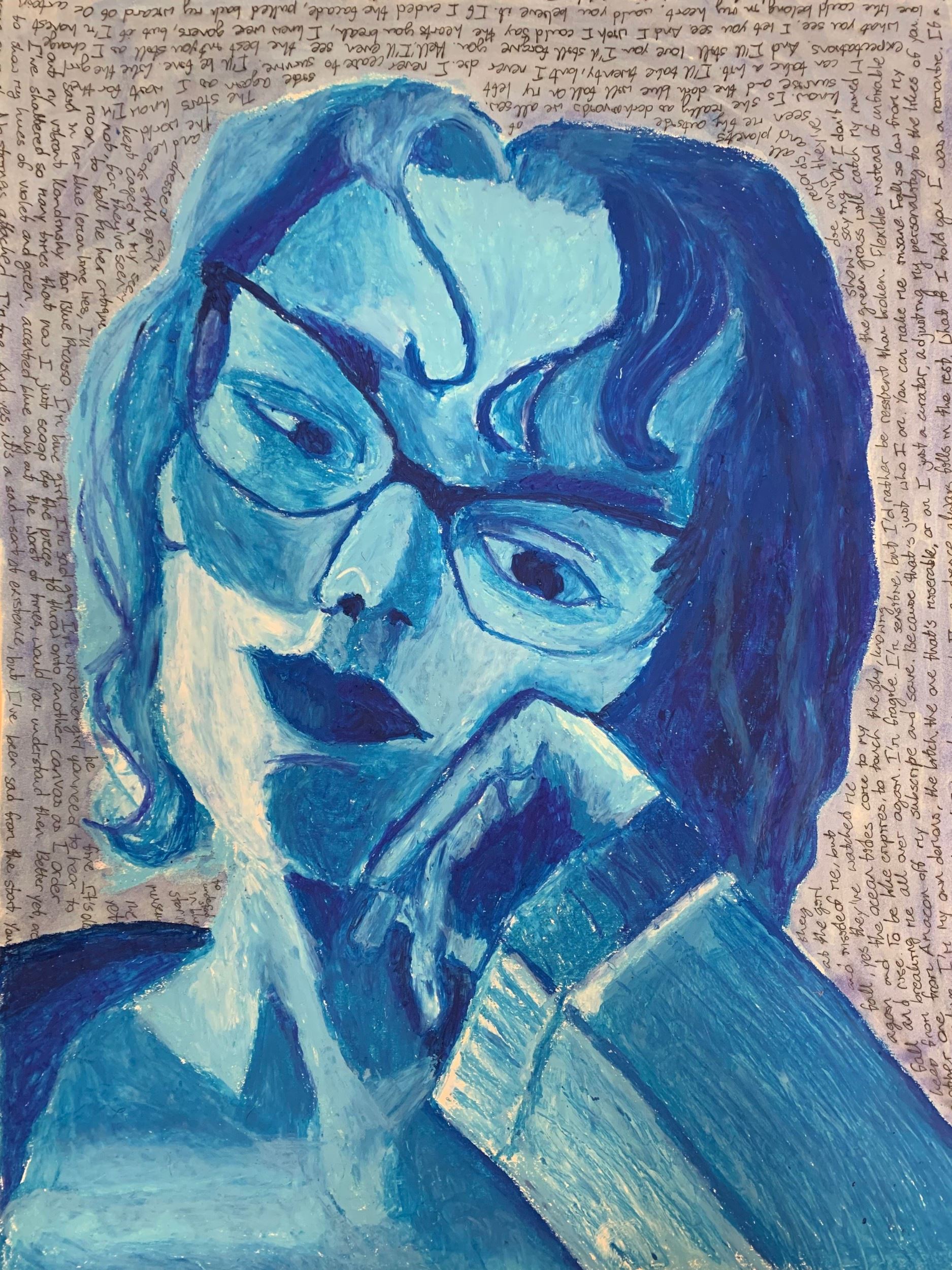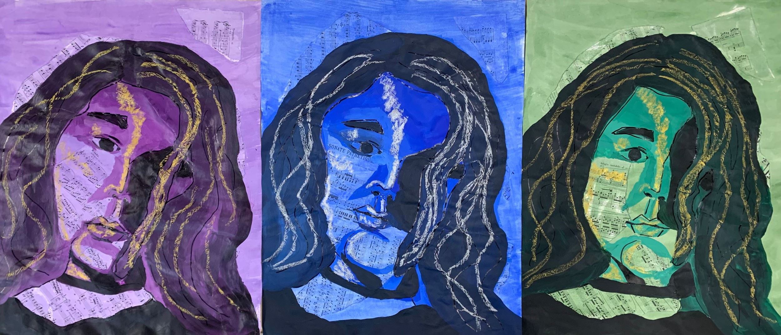 (series), reflects this. I used a music score of Piano Sonata No. 8 by Beethoven, also known as Sonata Pathetique, meaning “evoking pity.” I experimented with mixed media, utilizing acrylic paint, oil pastel, oil paint, watercolor, and collage in this piece. The expressions change from artwork to artwork in the series to demonstrate the three stages of grief I’ve felt: acceptance,