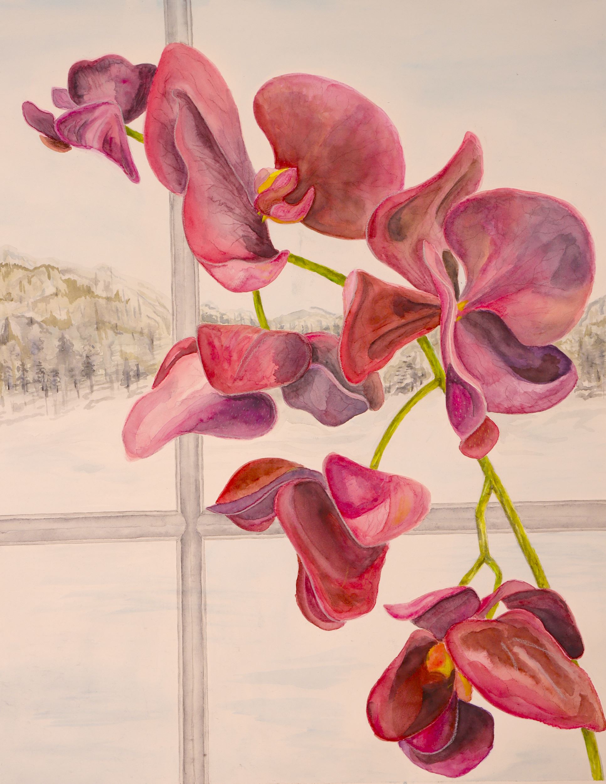 While looking around the room for inspiration, I saw an orchid plant that I thought would be fun to work with. I chose to experiment with water color for the first time in a couple years, and although the piece didn’t come out exactly the way that I would’ve liked it to have, it was still a fun experience trying to work with water color. If I could create this piece again, I would try to be more loose with my brush strokes to give more of a watercolor effect, but I do like the bright warm colors contrasting with the cool pale background.
