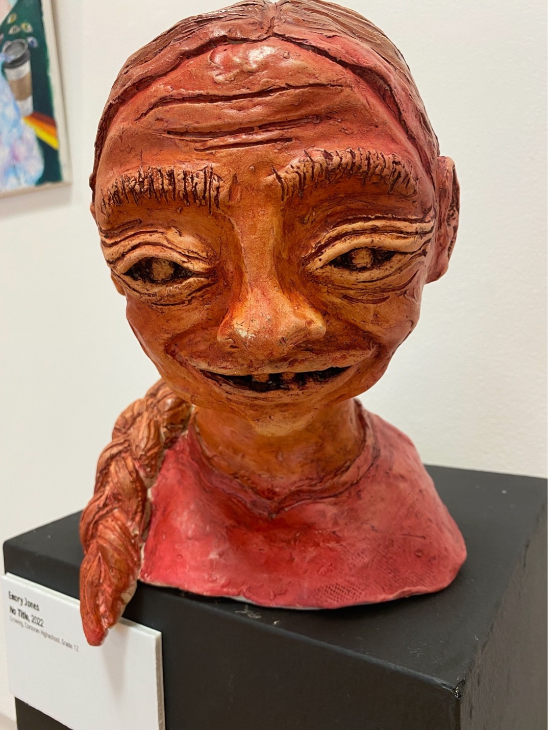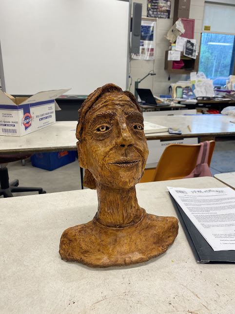 Sculpting the face and watching it transform was my favorite part of this artwork. Shaping the shoulders was the least favorite part. Too much adding Clay.