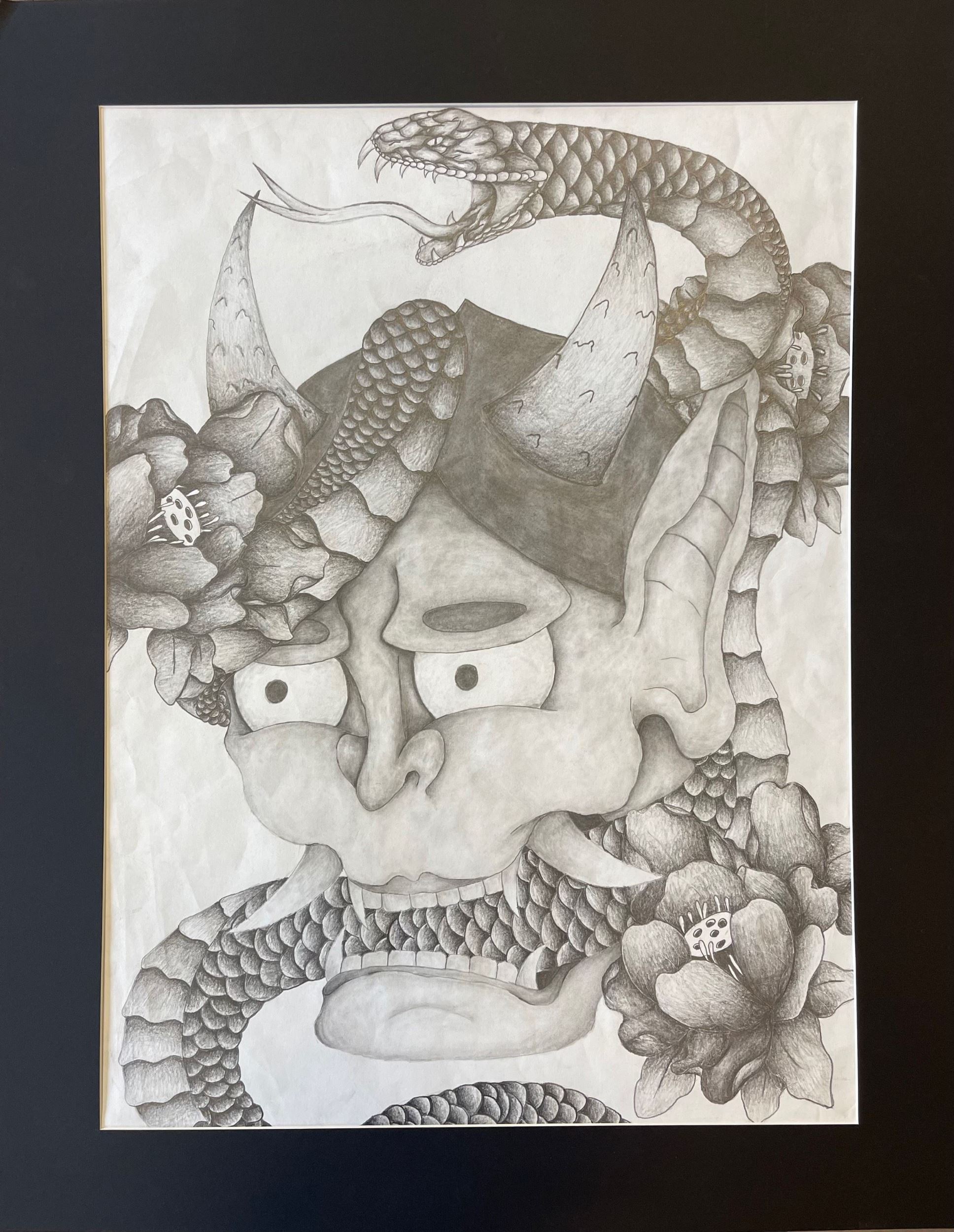 My favorite part of this art is the snake, and the least favorite part is the shading. My inspiration for this art is Japanese tattoo. I would change how I shade it. I learn how to shade.how the art came out surprise me. I draw the demon head first then the snake which took me a while to get it the way I like it. I later add the flower to add more to the drawing.