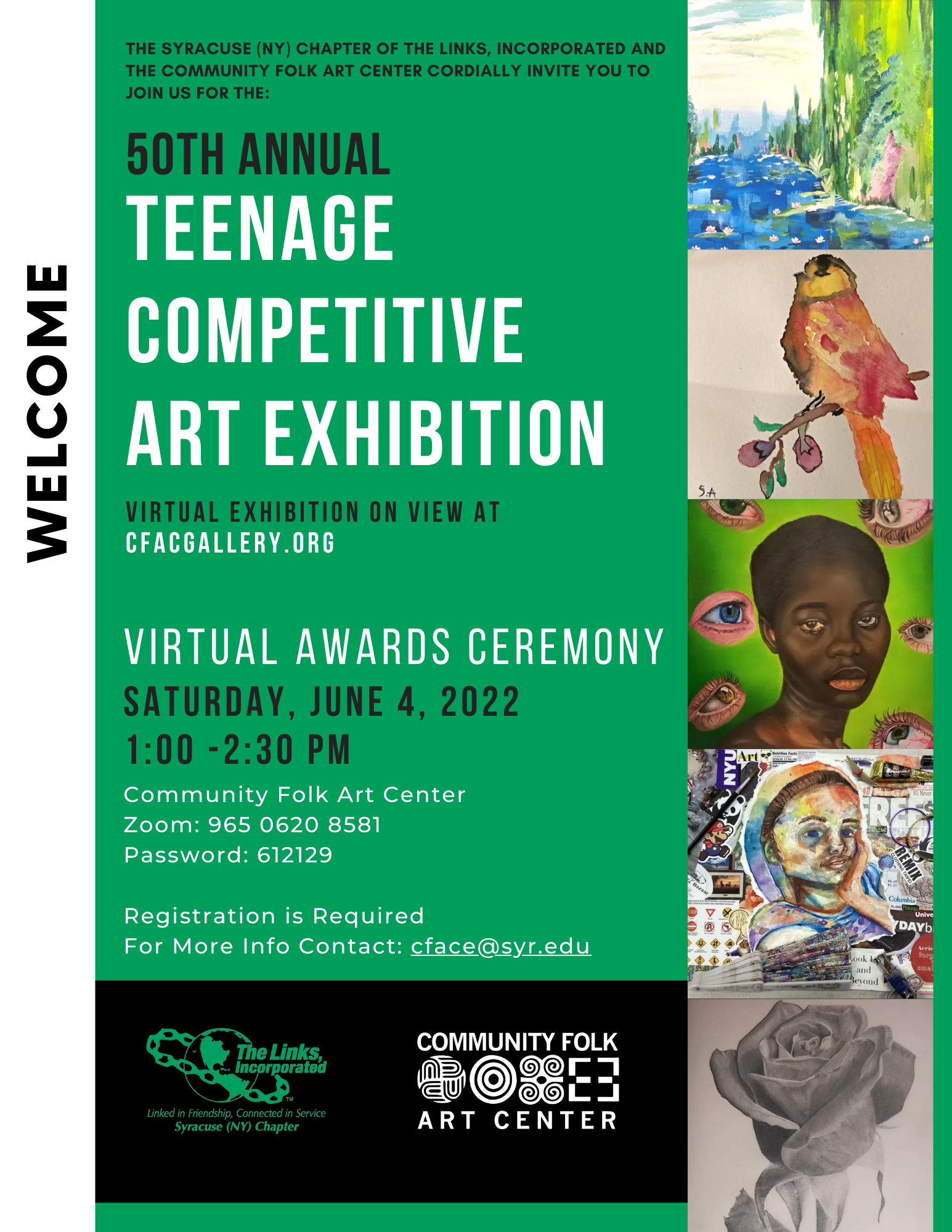 The Syracuse (NY) Chapter of The Links, Incorporated in partnership with the Community Folk Arts Center, is proud to present The 50th Annual Teenage Competitive Art Exhibition. The need for an exhibition started fifty years ago when three high school teachers: Charles Wollowitz and Roberta Braen of Nottingham High School and Nancy Peck of Corcoran High School, and the Community Folk Art Center Director, Dr. Herb T. Williams decided to collaborate on an artistic mission for students. They engaged in a strategic planning process to provide creative exposure, opportunity and mentoring via the creation of an art competition for minority students. The Teenaged Art Exhibition concept was a result of this process. The Syracuse (NY) Chapter of The Links Incorporated, recognized in the community for its emphasis on the Arts was the primary organizer of the original Teenage Competitive Art Exhibition in partnership with CFAC and the Syracuse School District. The art show’s mission is to provide a quality competition that offers an opportunity for Syracuse area high school students, especially students of African Descent, to exhibit their work. In addition, the Links designed The Annual Teenage Competitive Art Exhibition to enhance the community’s appreciation for the Arts.